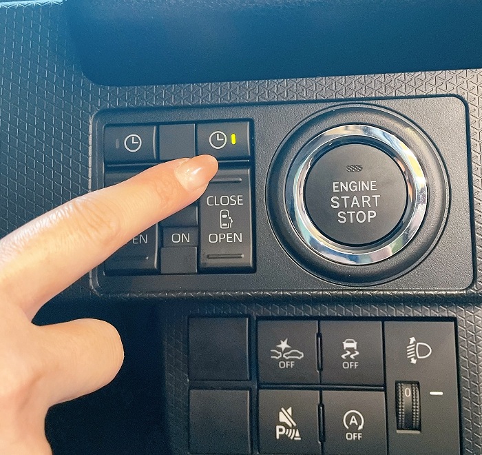 ① エンジン停止後、予約したい側(左:助手席側、右:運転席側)の時計のマークのボタンを長押しするとランプが点灯します。