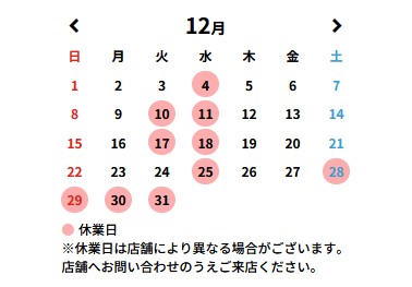 12月の定休日は毎週水曜日、第2第3火曜日となります。また、年末年始の休業日については改めてご案内いたします。