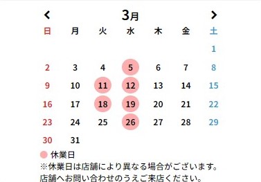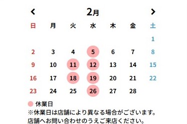 毎週水曜日、第2・第3火曜日が定休日となっております。