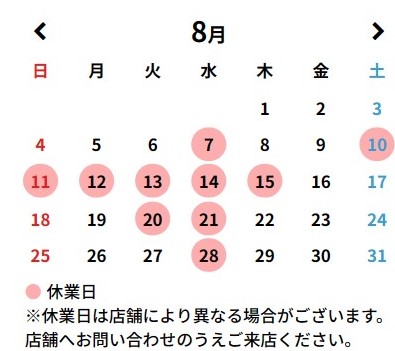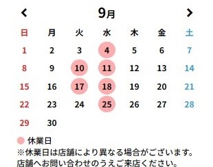 9月の定休日は毎週水曜日、第2第3火曜日になります。