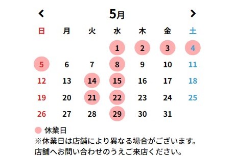 5月の定休日は毎週水曜日、第2第3火曜日になります。