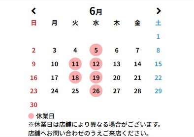 6月の定休日は毎週水曜日、第2第3火曜日になります。