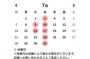 7月の定休日は毎週水曜日、第2第3火曜日になります。